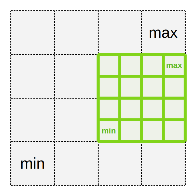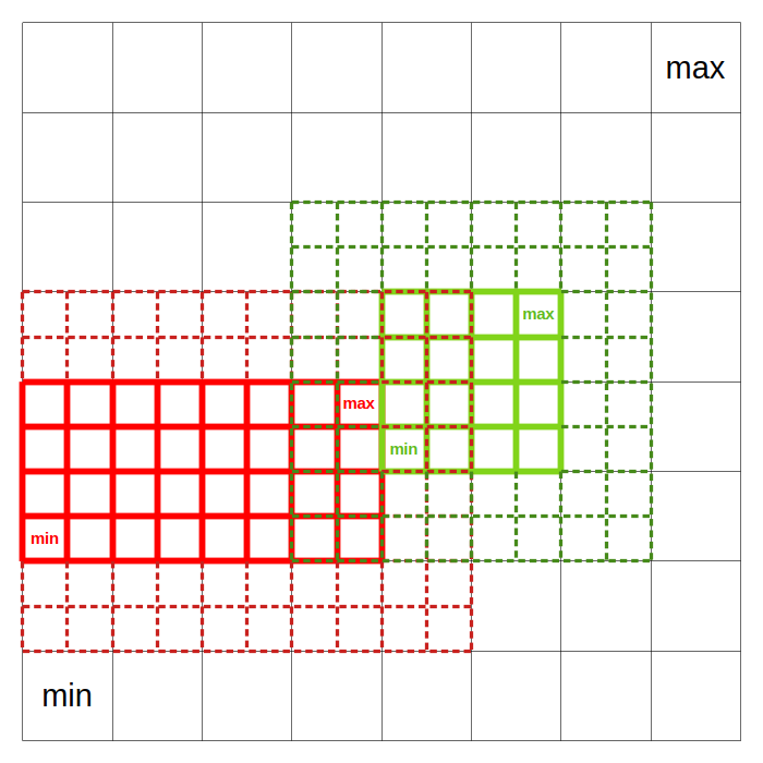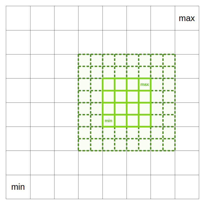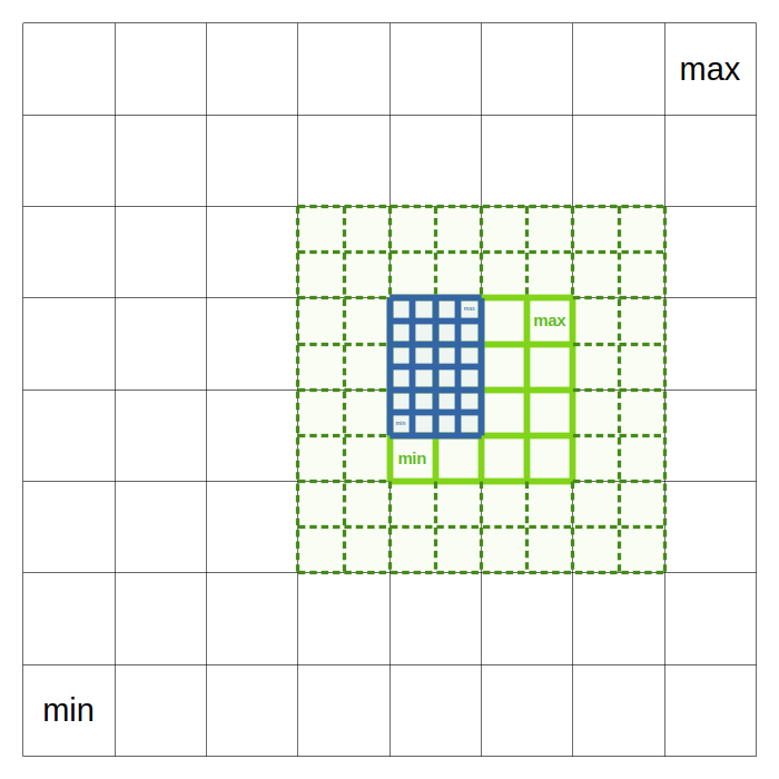 Pour l'AMR type 3, un patch est un ensemble de mailles d'un même niveau et englobé au sein d'une boite englobante (patch régulier). Cette boite englobante est décrite par les coordonnées topologiques de deux mailles dans la grille cartésienne : min et max.